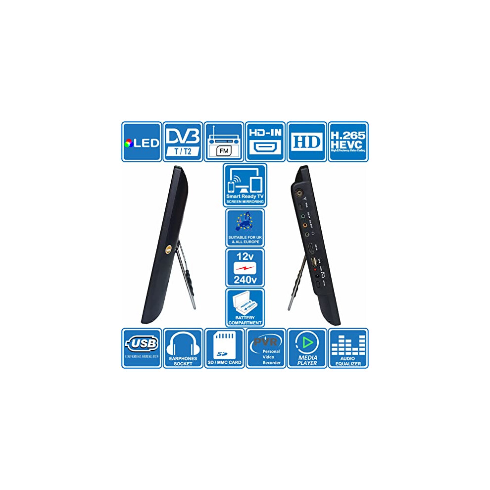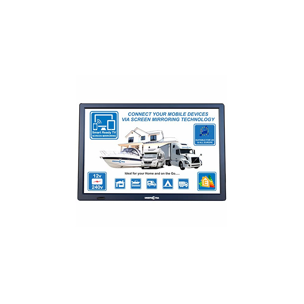 ProductDescriptionDescriptionSMARTREADYTV:Connectyousmartmobiledevicesviascreenmirroringtechnology.NEW2023yearmodel.âUnispectraLEDTV140T2MFB-ABâitâsaclassicdesignTVwithathinframearoundthedisplay.ThedisplayismadebyusingthenewgenerationLEDtechnology.AcceptsHDchannels.DuetothesmalldimensionstheTVwillperfectlyfitinthekitchen,aswellasboatandanyvechicleoritcanbeusedasaCCTVmonitor.Idealforalltravellersascanbepoweredby12Vor240VDC.Screen:UnispectraTVhasascreendiagonalof14inchesitâsapproximatelyequalto35.5cm.NewgenerationâHDâLEDscreentechnologydisplaystheexpressiveandcontrastingpicture.Maximumresolutionofthescreenis1280Ã800pixels.Functionality:SuitabletouseinUKandallEuropeâUnispectraLEDTV140T2MFB-ABâhasanintegratedDVB-T2(Freeview)receiverduetowhichyouâllreceivethesignalsofthedigitalterrestrialtelevision.Built-inFMtunerallowstousethisTVasaradio.TheTValsohasthefollowingfunctions:SmartReadyTV-screenmirroringtechnology,Teletext,MediaPlayerandPVR(PersonalVideoRecorder).WiththehelpoftheMediaPlayeryouâllbeabletowatchandlistentomostofthevideoandmusicrecordingsfromtheUSBorotherexternaldrive,whichisconnectedtotheTV.PVRisprovidedfortherecordingofthedesiredvideostotheexternaldrive.Energyconsumptionanddimensions:Whenturnedon,itconsumesonly9Wofenergy,0.5Winthestandbymode.Itcanrunon240Vor12Vpowersupplywithbothleadsincludedinthepackage.Thedimensionsofthismodelare345x33x230mm,weight0.9kg.Hasbuilt-inbatterycompartmentwhichcanaccomodate2x18650Button-TopLi-Ionbatteries(batteriesnotincluded)AdditionalExtrasFREE-wall/ceilingbracketandrazorthin,highgaintvaerialwithmulti-mountoptionsincluded.